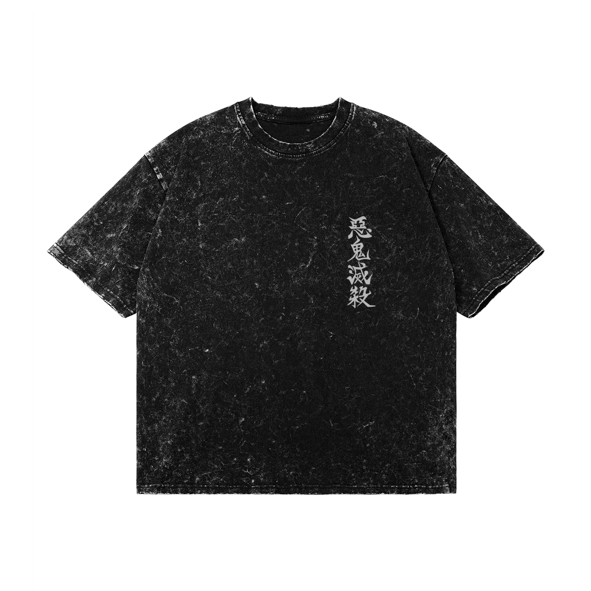 Demon Slayer Corps themed snow-washed t-shirt featuring the text ‘悪鬼滅殺’ on the chest and on the back ‘滅’.