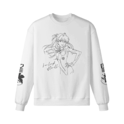 Evangelion sweatshirt featuring a line art illustration of Asuka Langley with the quote “I can laugh after all” across the chest and the sleeves featuring the NERV insignia.