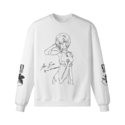 Evangelion sweatshirt featuring line art of Rei in her plug suit, paired with the quote “An Eva is a mirror.” With NERV themed sleeve art.