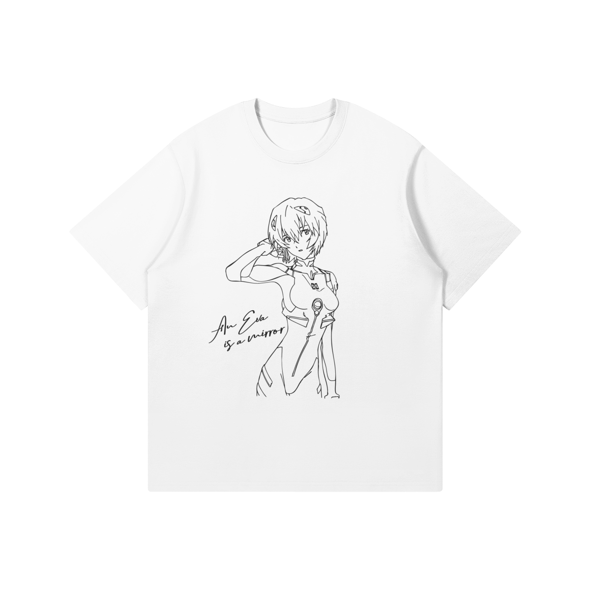 Evangelion t-shirt featuring clean line art of Rei in her plug suit and the quote “An Eva is a mirror”.