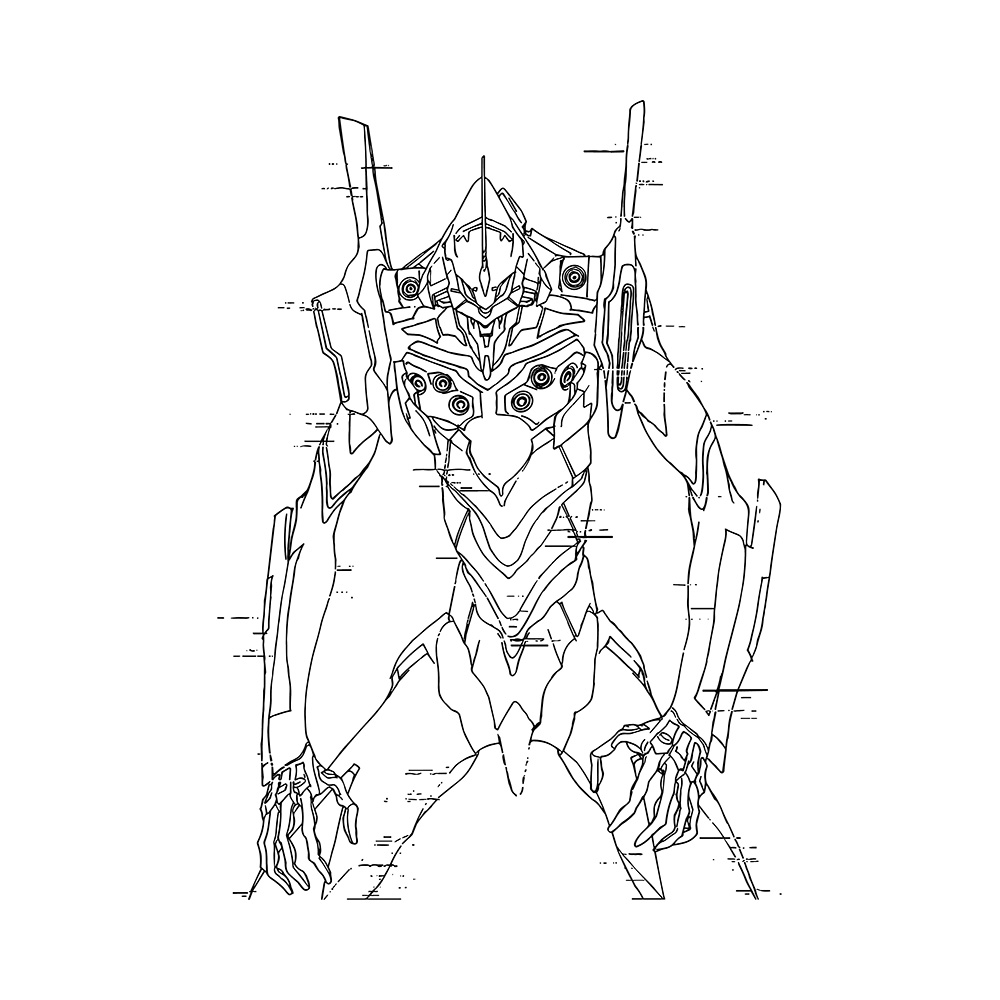 Evangelion sweatshirt with detailed line art of the EVA-01 mecha, paired with distressed “EVANGELION-01 TEST TYPE” typography down both sleeves