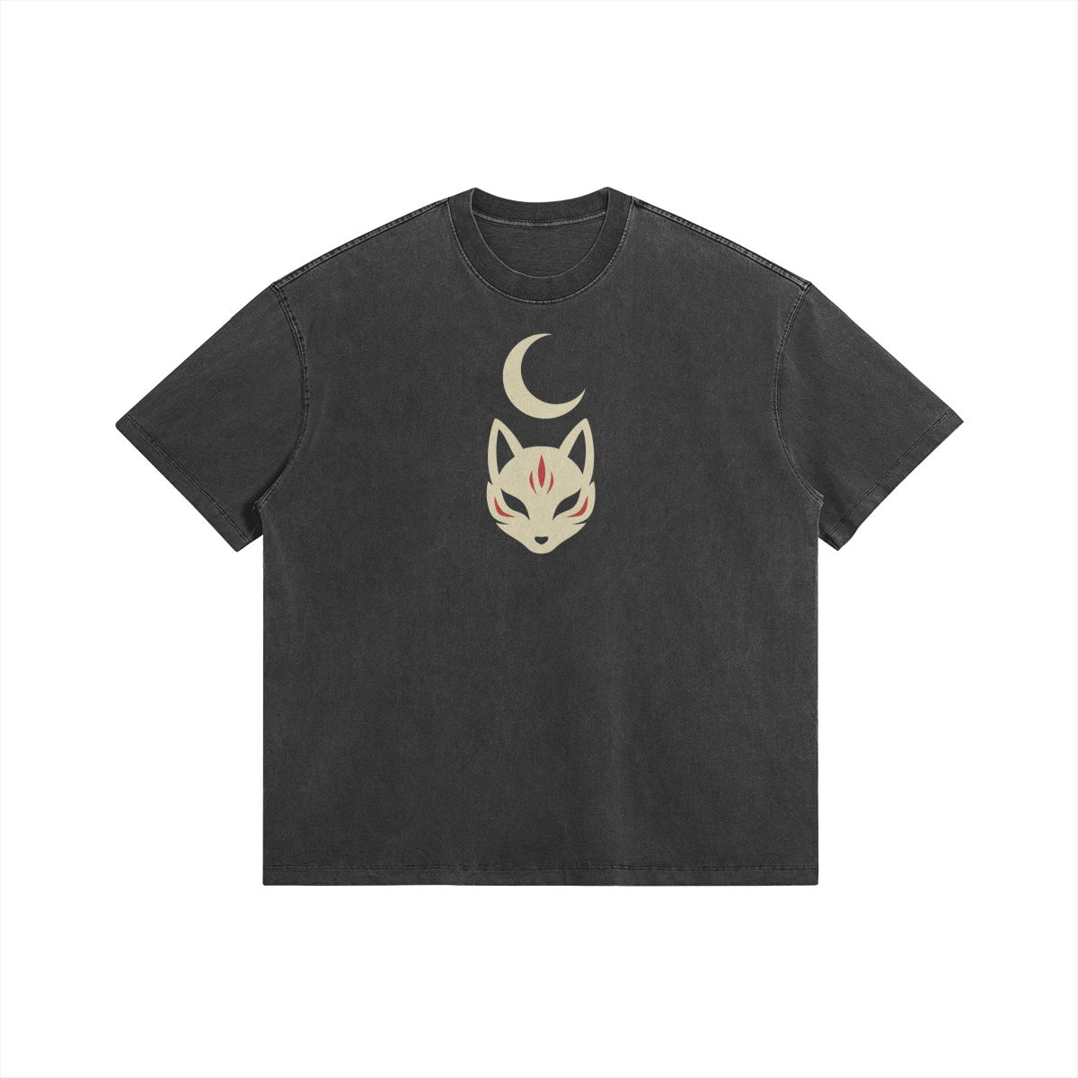 The back talisman reads 狐霊護符, “Fox Spirit Protective Charm.” Worn like an amulet, the vertical design carries restrained symbolism rooted in Japanese folklore. The front remains minimal with a crescent moon above the kitsune mask.