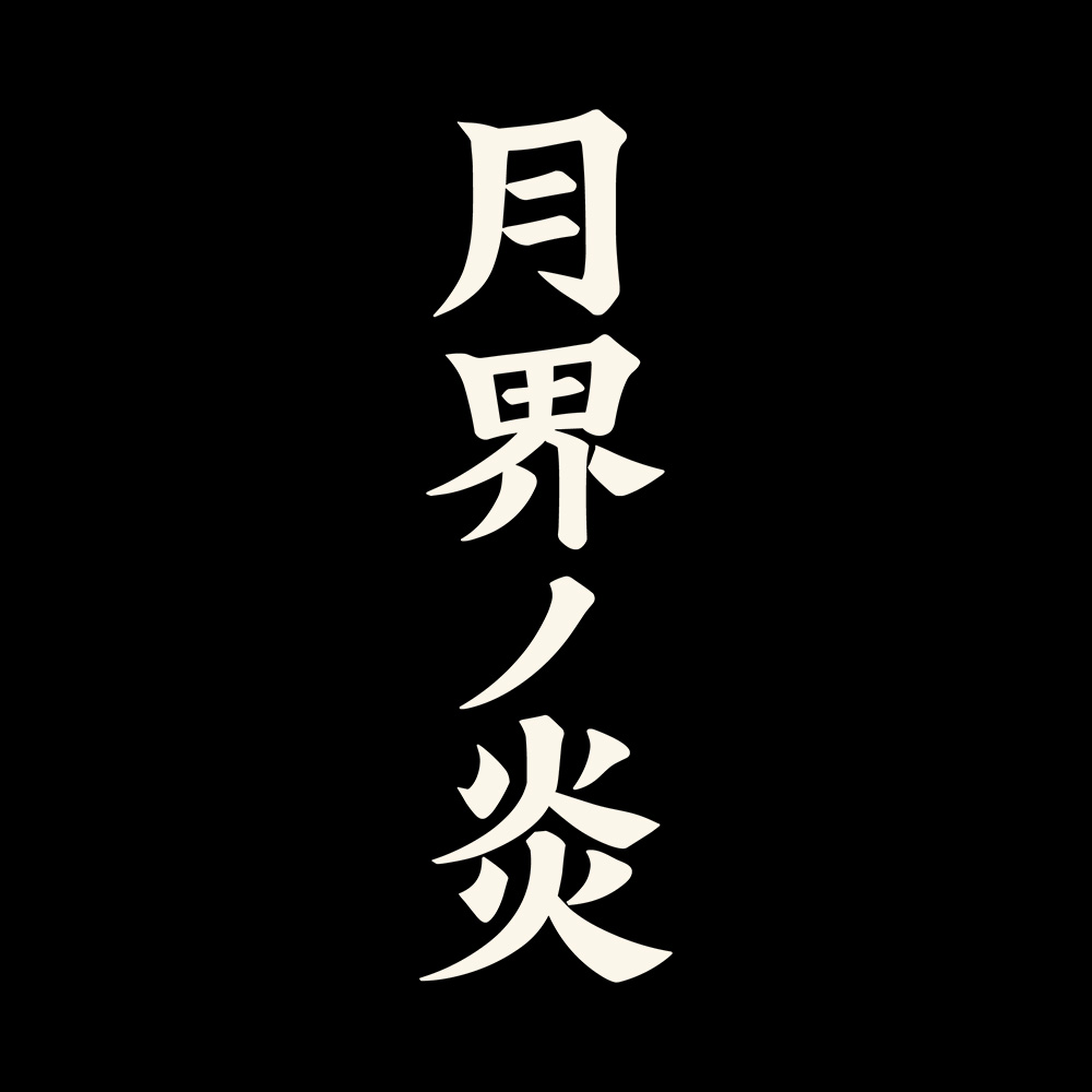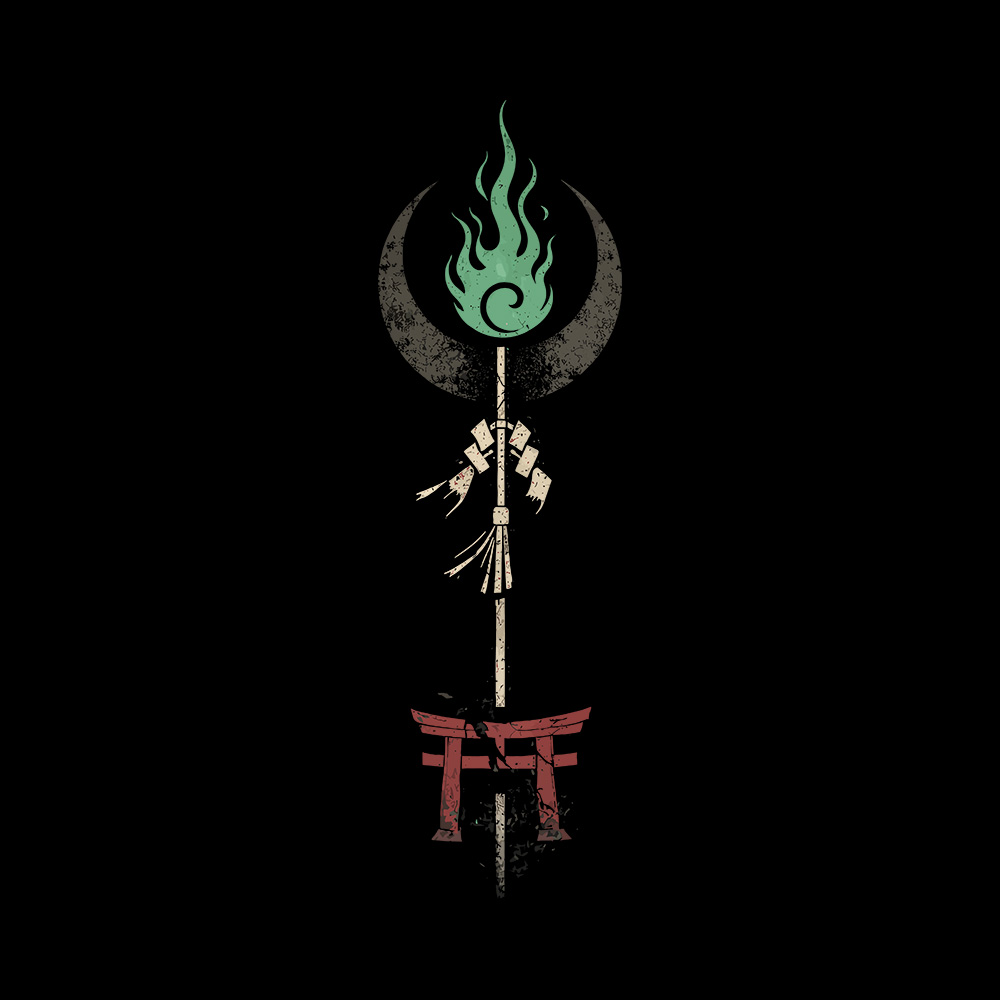 Gekkai no Hono (月界ノ炎) means “Flame of the Moon Realm.” A vertical shrine staff stands beneath a crescent arc, crowned with emerald spirit fire. The torii at its base marks the threshold between the human and yokai domains.