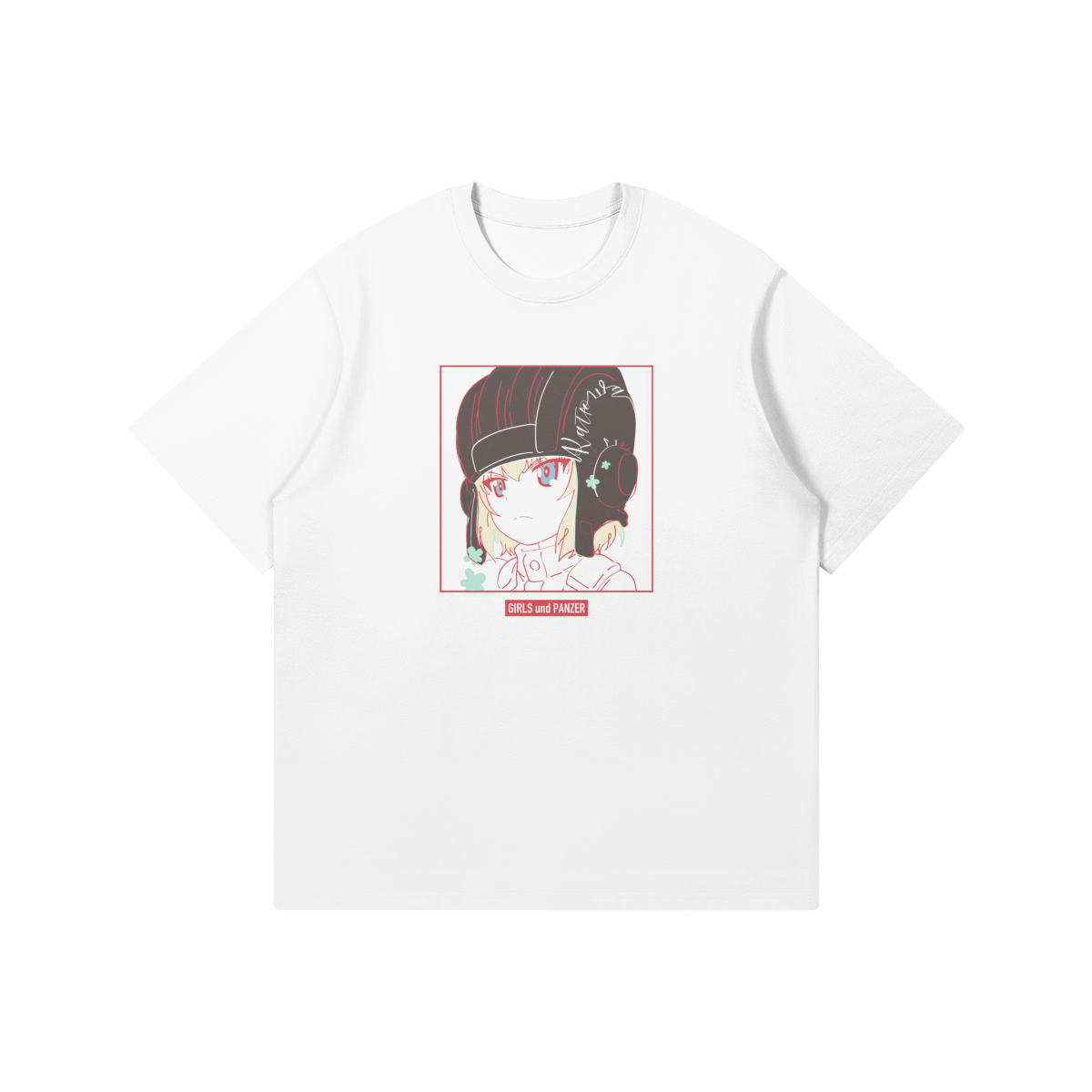 This Girls und Panzer t-shirt captures Katyusha in a clean minimalist illustration. The bold red tones and soft pastel accents create a balanced, modern anime aesthetic that stands out without being loud.
