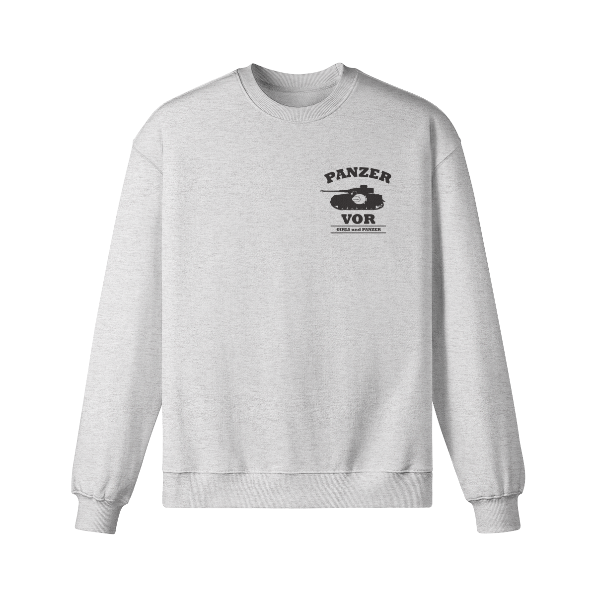 Stay warm with this subtle Girls und Panzer sweatshirt. Featuring a minimalist “Panzer Vor” chest print with the iconic tank and Anglerfish Team emblem, this crewneck is perfect for fans who want a low-key nod to their favorite series.