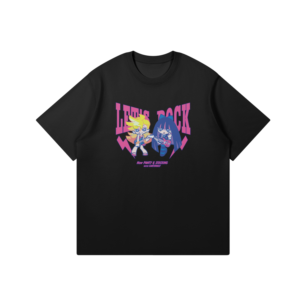 Amp up your look with the Panty & Stocking “Let’s Rock” tee. Featuring the duo ready to shred, this design brings bold colors and anime energy to heavyweight black cotton.