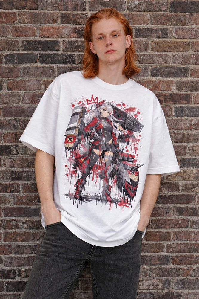 Command attention with this Prinz Eugen graffiti oversized t-shirt from Azur Lane. Featuring aggressive graffiti splashes, bold red accents, and striking character artwork, this t-shirt is built for statement anime streetwear.