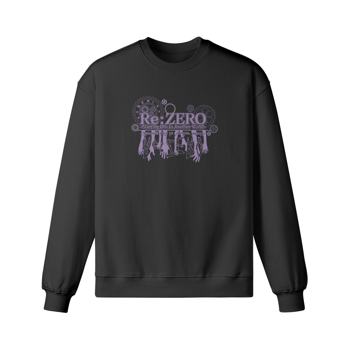 A premium heavyweight Re:Zero crewneck sweatshirt. The design features a striking purple graphic with mechanical clock gears and the eerie Betelgeuse lettering formed from reaching hands.
