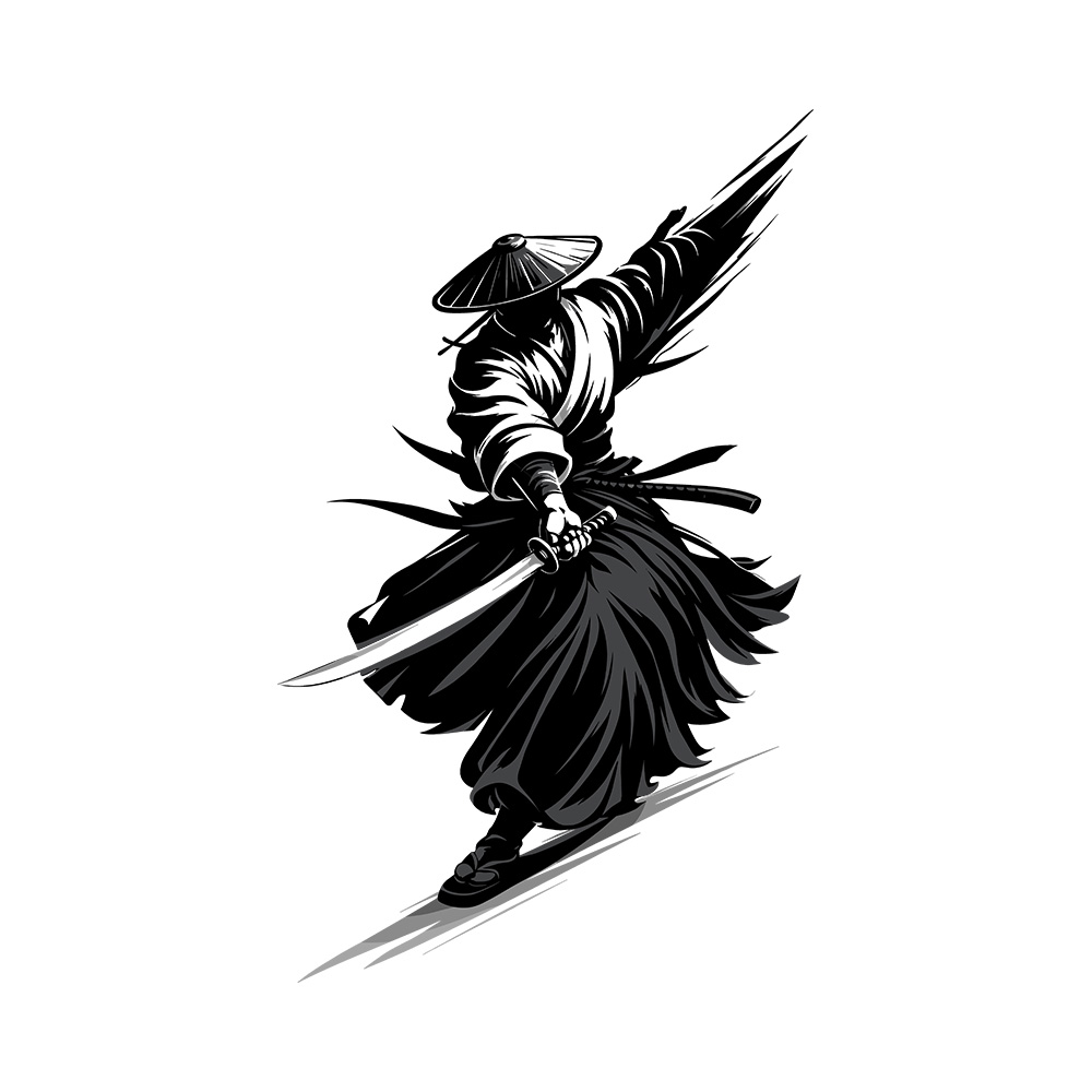 A lone samurai in motion, captured mid-strike with flowing lines and sharp contrast. The design is paired with the kanji Mushin (無心), meaning “no mind”, a state of instinct, clarity, and action without hesitation.