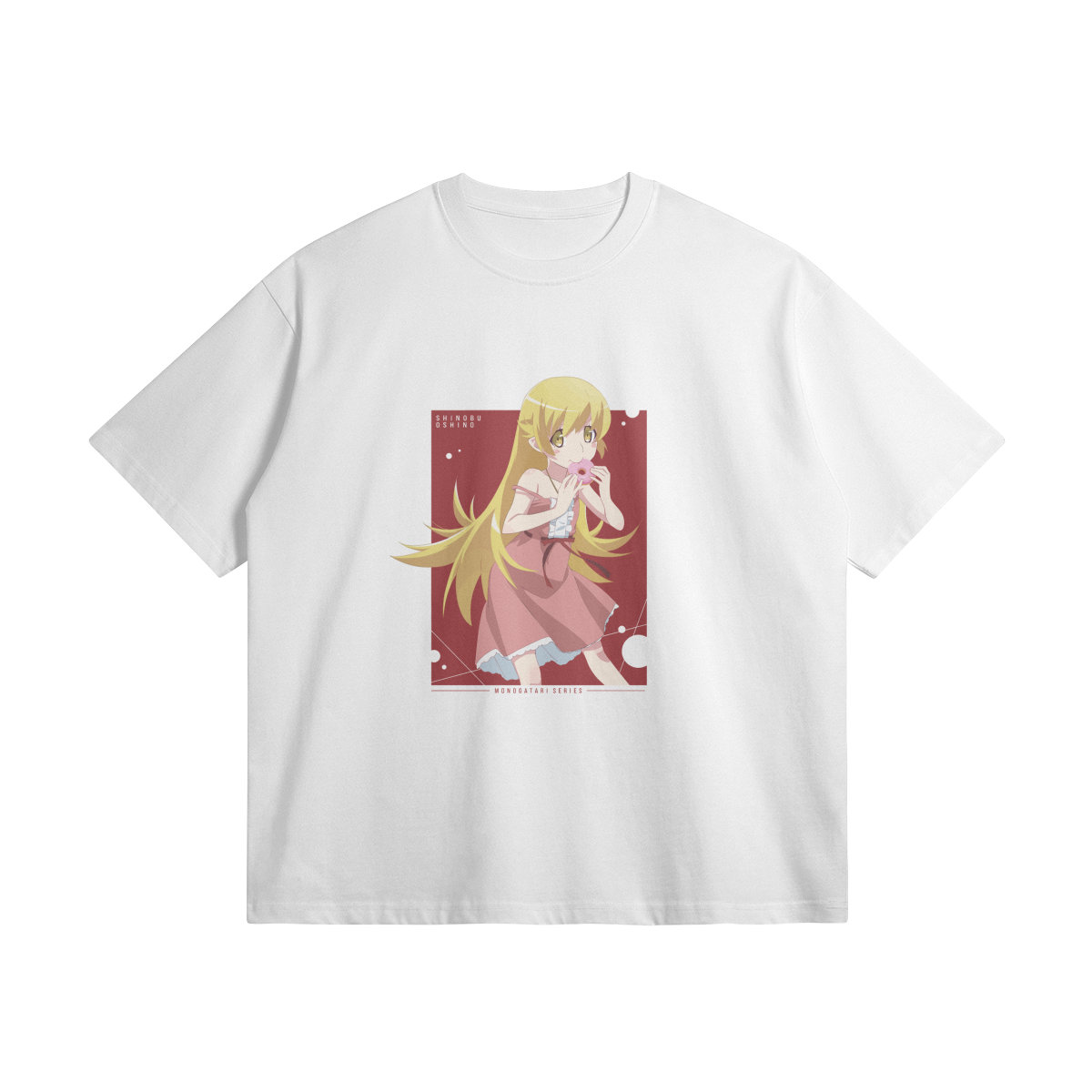 Monogatari Series heavyweight oversized t-shirt featuring artwork of Shinobu Oshino.