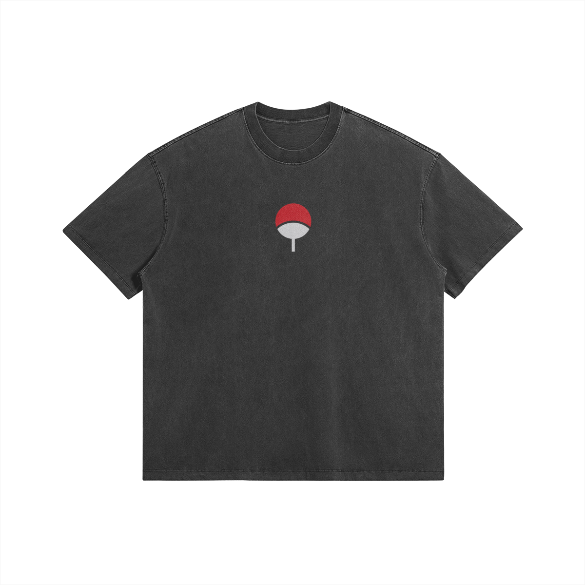 Heavyweight Naruto t-shirt with a faded wash finish, featuring an Uchiha Fan embroidery on the chest. Embroidery is approximately 3×4 inches (8×10 cm) wide.