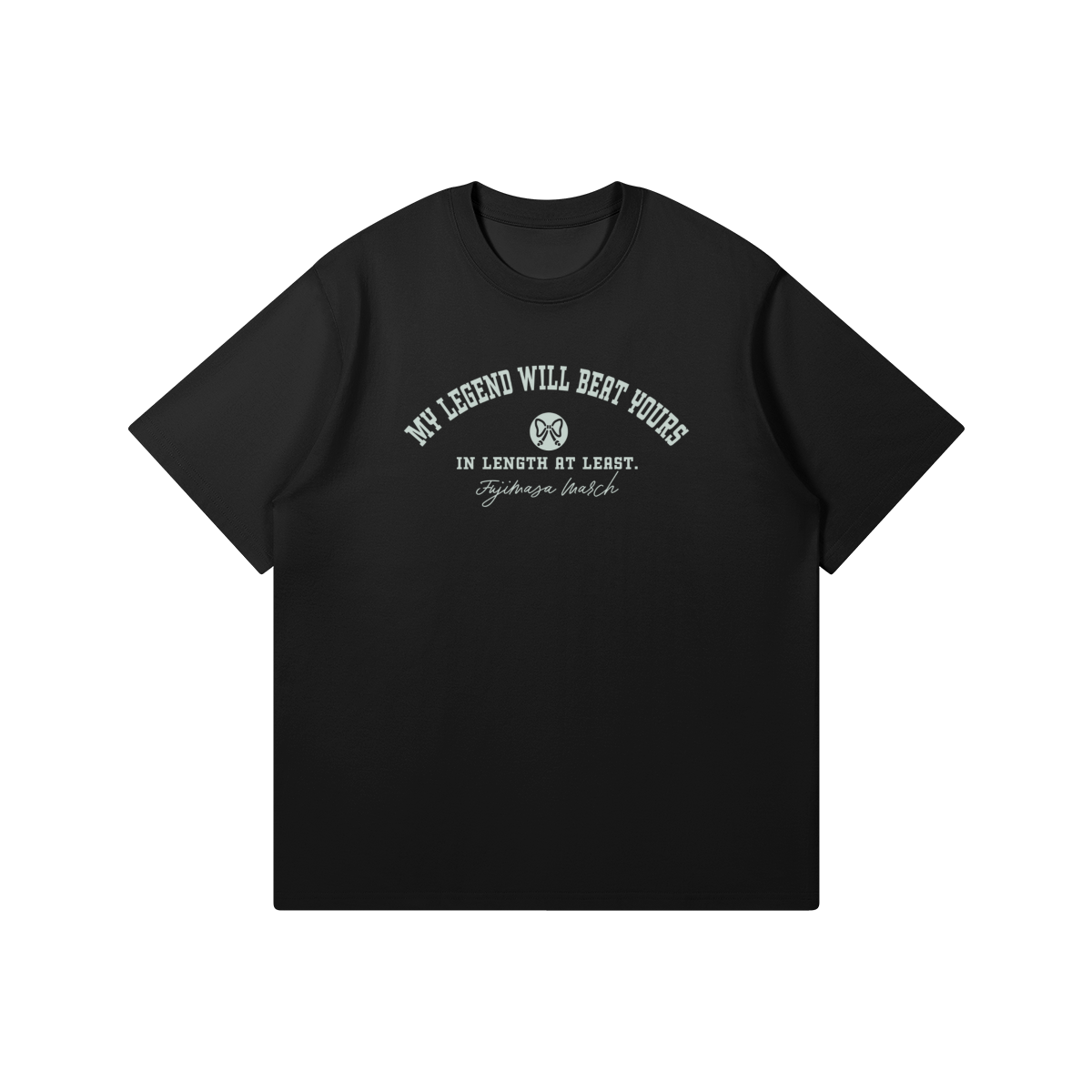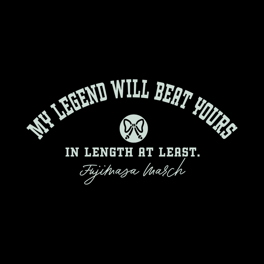 T-shirt featuring a front print inspired by Fujimasa March from Umamusume. The design uses a typographic layout with arched text, a small emblem, and a character quote, giving it a clean graphic style while referencing the series.