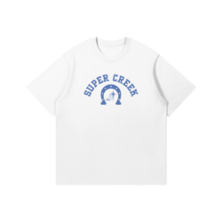 This t-shirt features a front print inspired by Super Creek from Umamusume. The design uses an arched name layout with a horseshoe emblem and small motif detail, creating a simple graphic look that references the character while remaining easy to wear.
