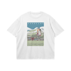 Yuru Camp boxy t-shirt featuring artwork of Nadeshiko out on a trip.
